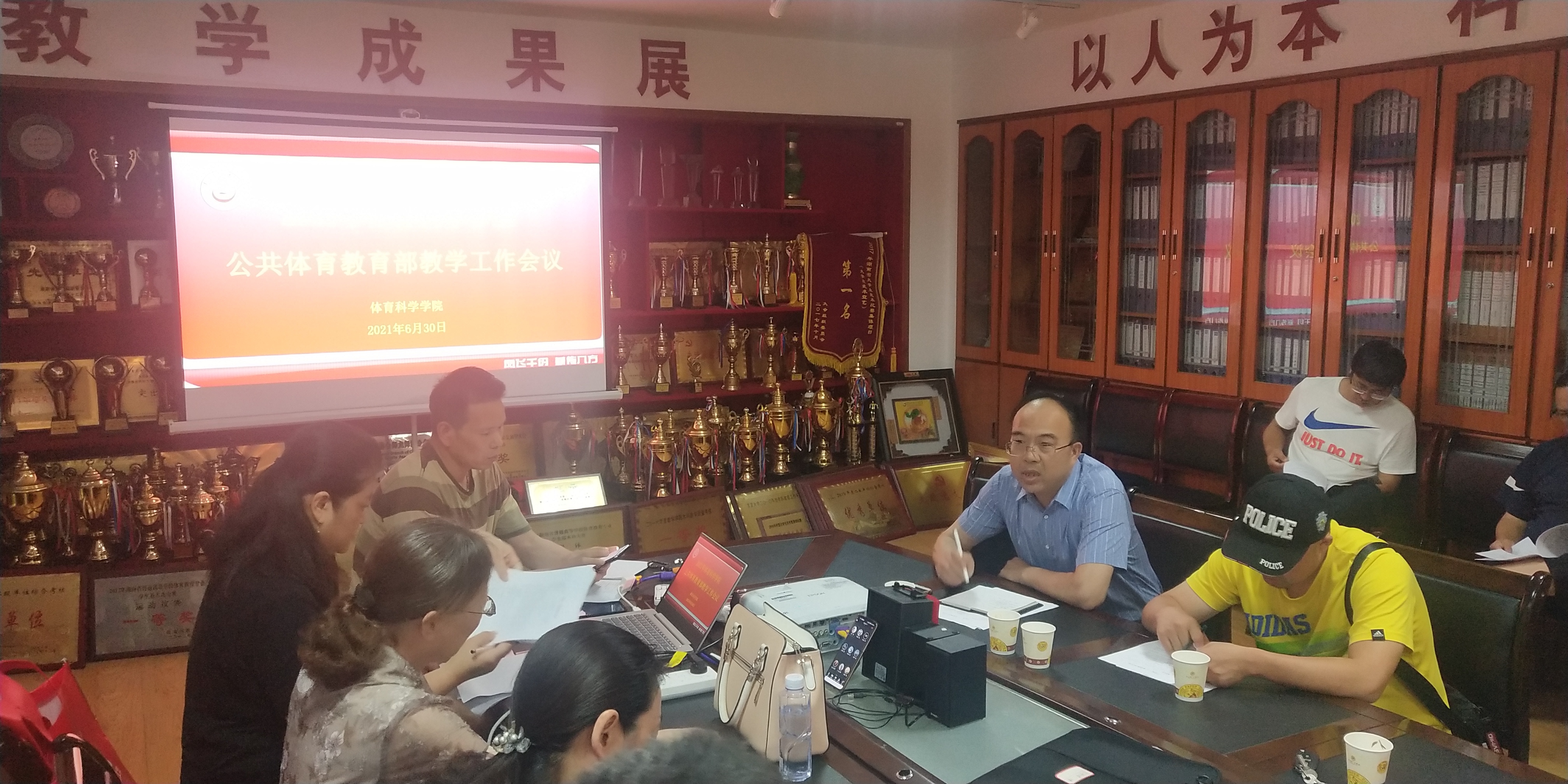 本网讯(通讯员吴文群报道)6月30日下午3点,公共体育教学部在体院二楼荣展室召开教学工作会议,公共体育教学部主任李政主持会议,体育科学学院党政领导及吉首、张家界校区担任大学体育课老师参加,会议形式采取现场参会和线上腾讯会议相结合。