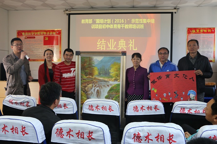 结业典礼上,来自新疆的姜建忠代表全体学员以“从我的全世界路过”为题,全面讲述了从接到培训通知到培训心理历程,表达了对本次国培的感激、对学员的不舍、对民传项目的传承、对国培老师及团队的依恋,全场为之动容。田筱鸿院长发表感慨,首先感谢各位学员们如此信任和支持国培工作组的工作,并且希望学员们能继续坚持做体育教师的初衷,对学员们勤奋好学、团结友好的作风给予高度的赞赏,对老师们提出了学员之间要加强联系,珍惜这份难得的缘分,保持经常性的沟通和交流,也提出了衷心的祝愿,祝愿学员们家庭和睦,事业一帆风顺。接着,国培学员们为学院赠送了自发组织制作的“做体育文化人”简报以及油画“高山流水”。最后,肖松书记等五人为在座的学员们一一颁发了“优秀班干部”、“结业证书”、“优秀学员”证书。