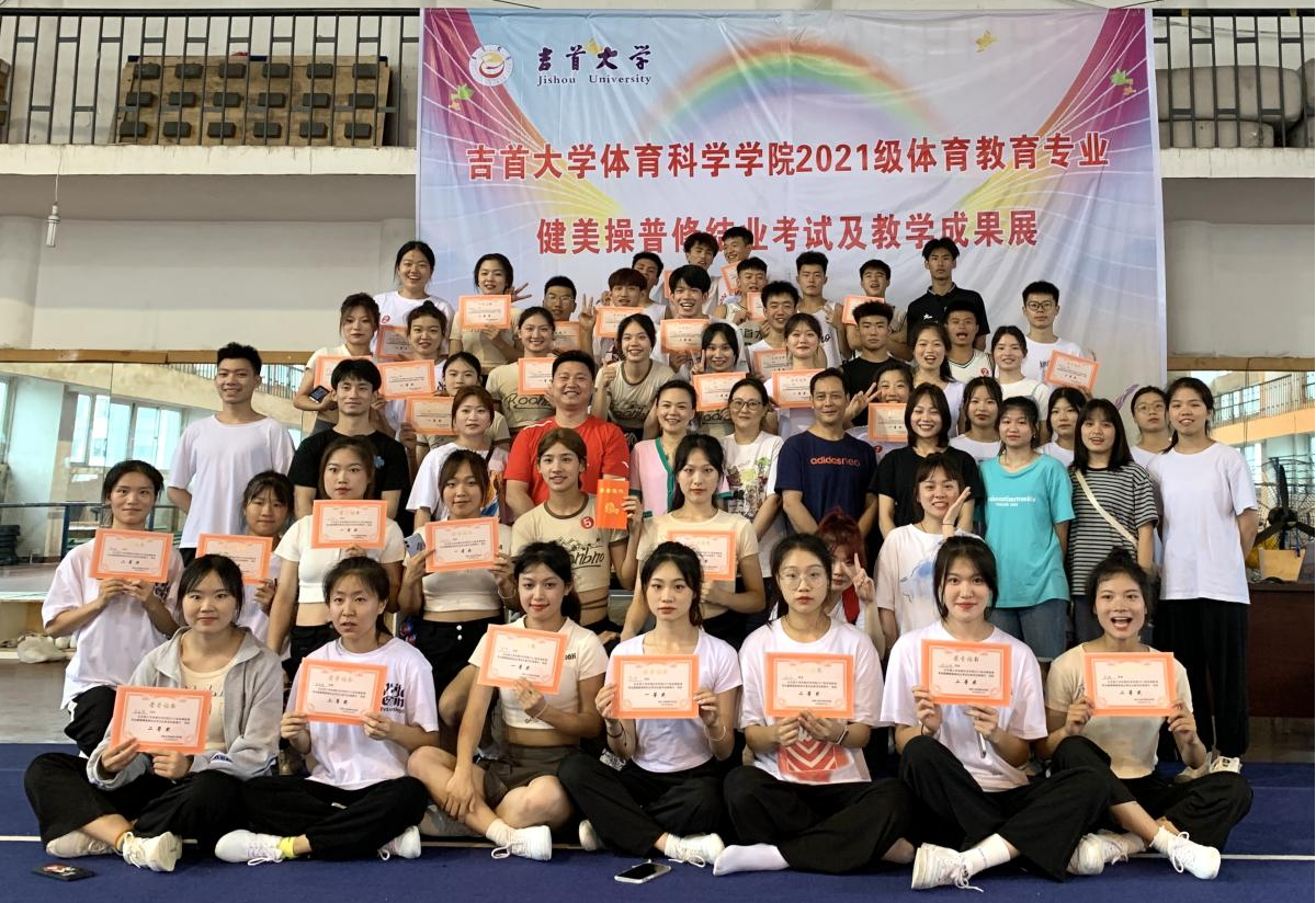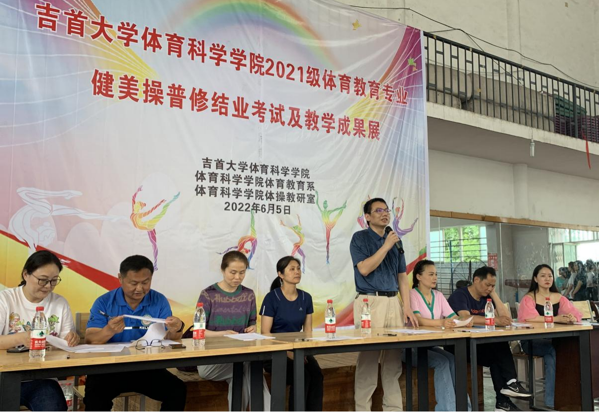 2022年6月5日14:30点,威廉希尔中文官网威廉希尔中文官网体操教研室在体操馆隆重举行2021级体育教育专业健美操普修结业考试及教学成果展活动。学院副院长万义、体育教育系主任文理中老师、体操教研室主任朱晓红老师、学院教务办王月英老师、体操教研室陆晨教授、王海波老师、田茂林老师、刘生贵老师和覃英老师出席了本次汇报展演。