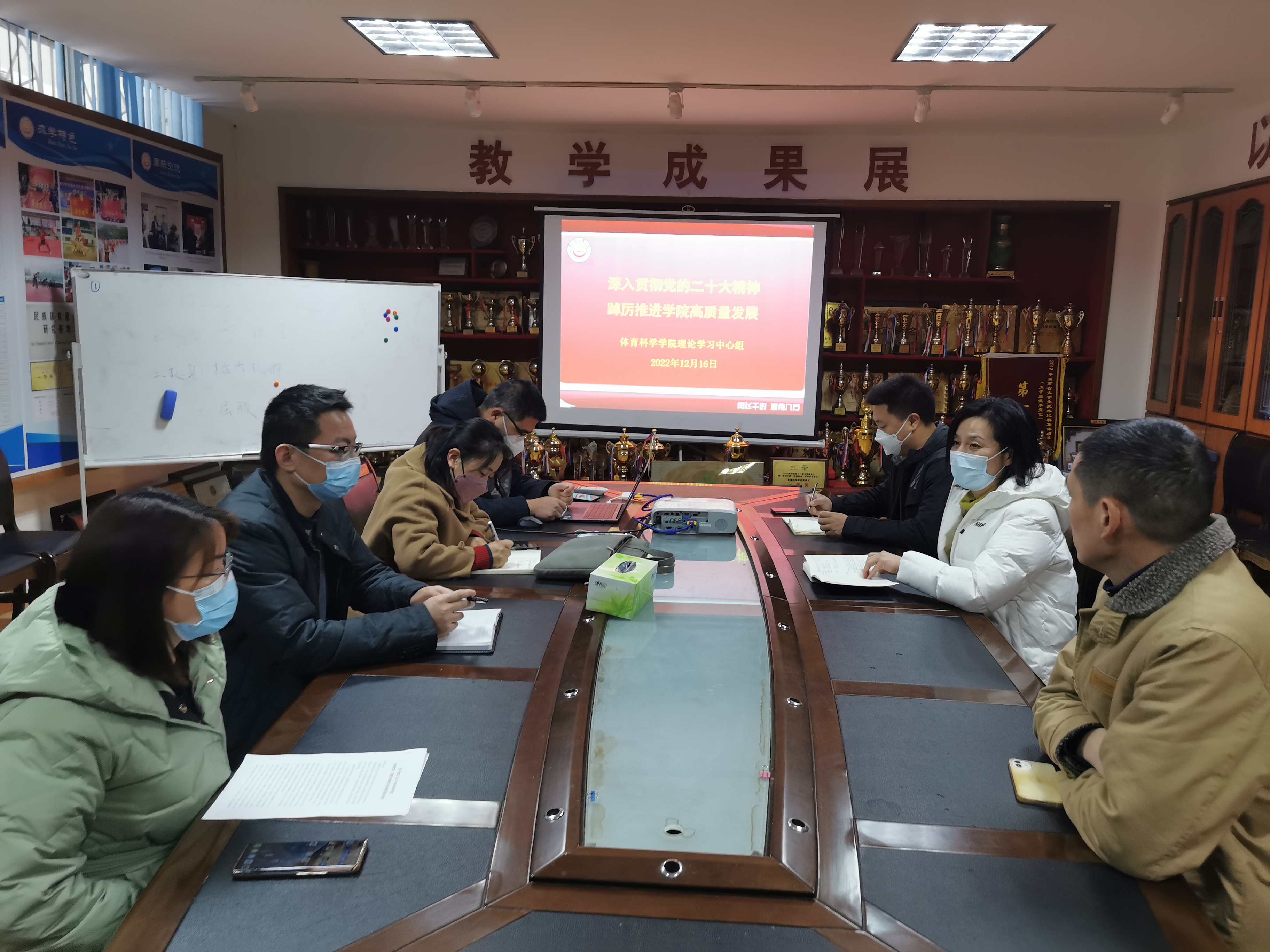 本网讯(通讯员 周剑波 报道)为进一步加快建设体育学国家一流建设学科,把学习贯彻党的二十大精神同落实立德树人、科研创新、服务社会等工作紧密结合,12月16日上午,体育学院党委理论学习中心组在体育学院二楼荣展室召开集中2022年第10次集体学习研讨会。专题学习党的二十大精神。会议由学院党委书记吴湘军主持,万义、周剑波等学院主要党政领导,以及其他党委成员参加会议。