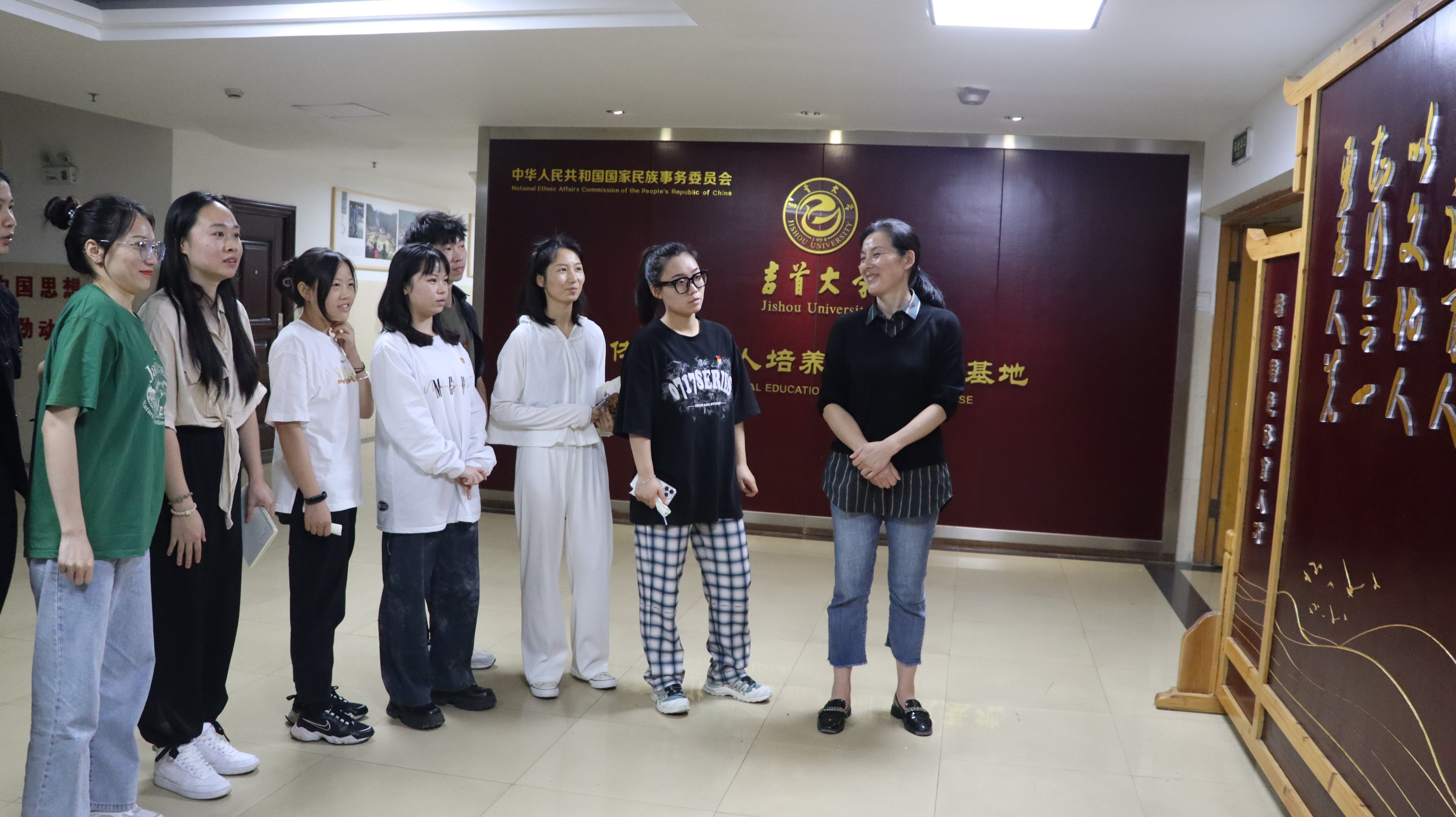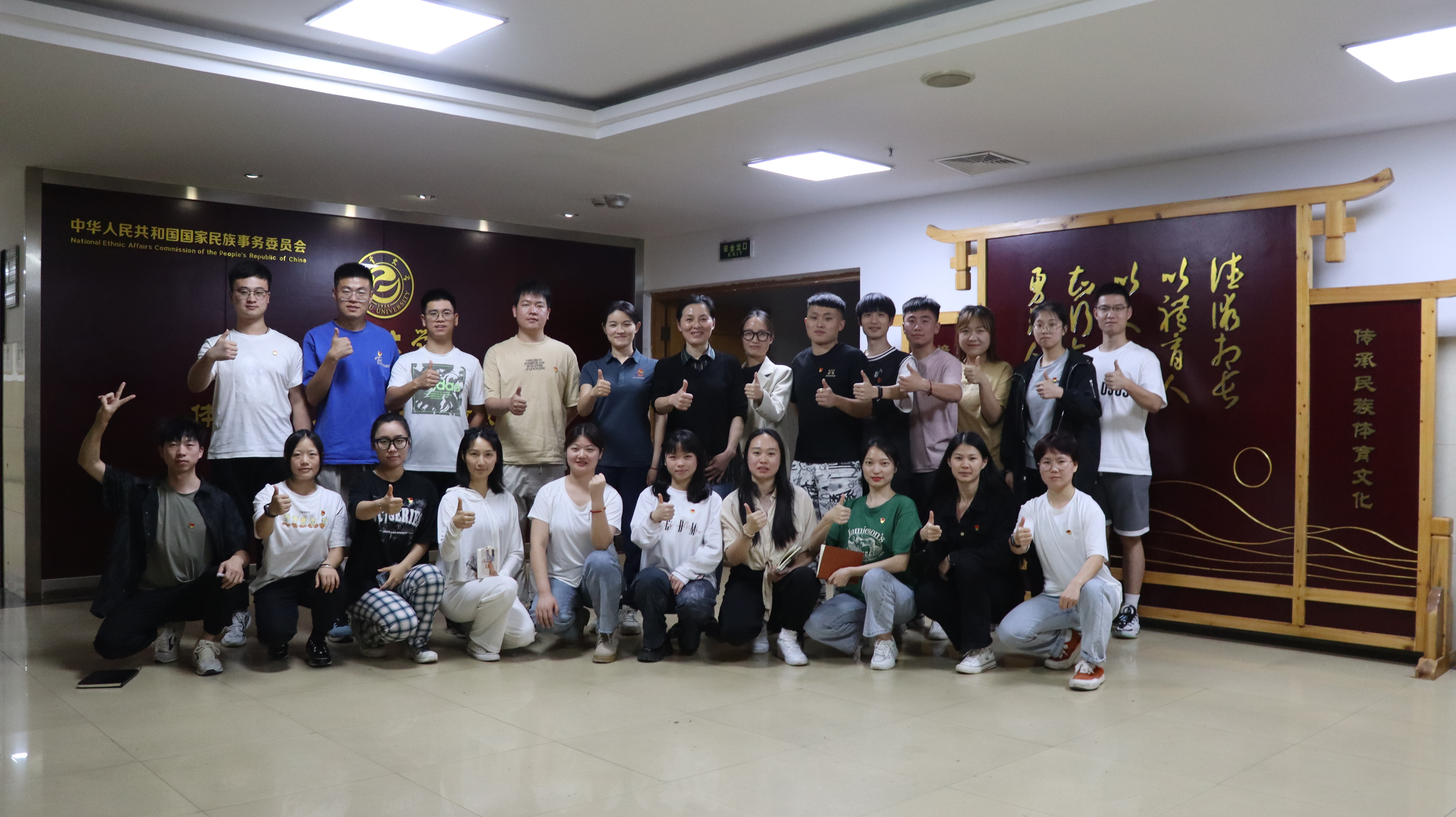 第四项议程,吴湘军带领大家参观国家民委立项的体育文化人培训培养重点基地,在“德术相长 以体育人、以文化人、知行合一、勇为人先”的牌匾前,吴书记语重心长地向大家讲解了“体育文化人”的内涵,鼓励大家进入职场后,要不断努力学习,敢为人先,勇做“德术相长的体育文化人”排头兵,为体育教育事业奉献自己青春的力量。