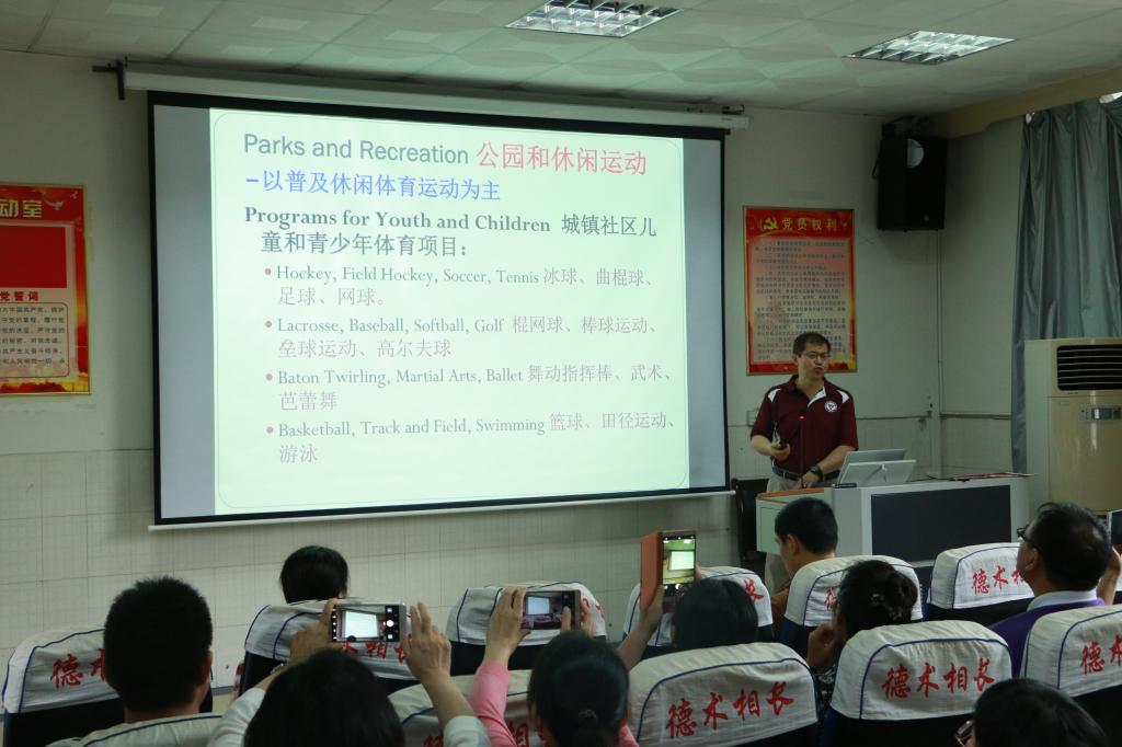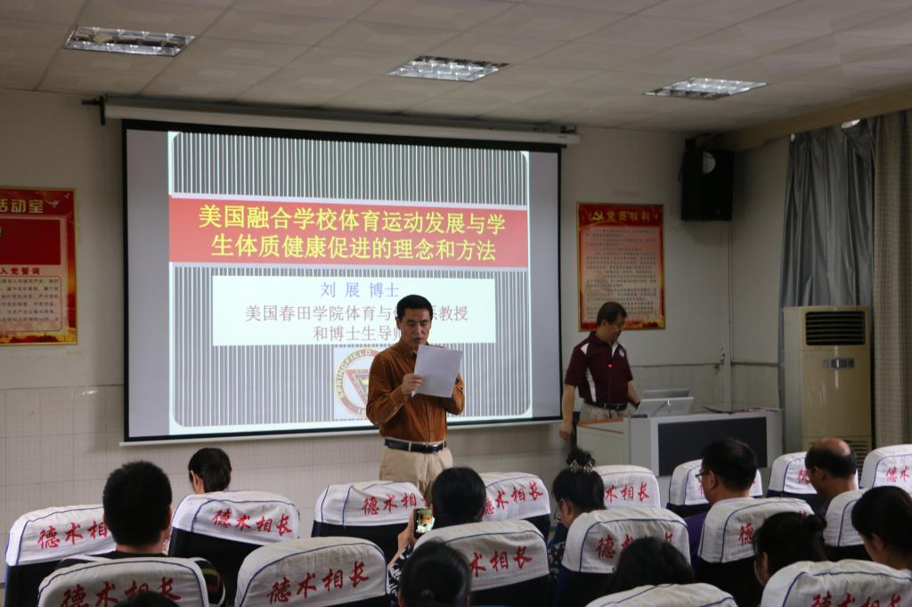刘展教授首先从美国春田学院发展的历程进行介绍,随后从美国学校运动发展的模式和现状,围绕学校学生体质健康促进的理论和方法展开讲座。他细解读了美国青少年九条体育运动标准,从美国小学、初中、高中和大学等阶段的背景信息对美国学校运动发展的模式和现状进行分析,深入探讨了美国学校和俱乐部体育运动发展模式的缺陷,提出了竞技体育运动的投入和发展无法从根本上解决学生参加健身活动和促进体质健康的问题。让我们对美国学校体育运动有了新的认知,深刻认识到学校是提升学生体质健康的重要场所和领地,是影响青少年体育锻炼行为促进体质健康的重要途径。