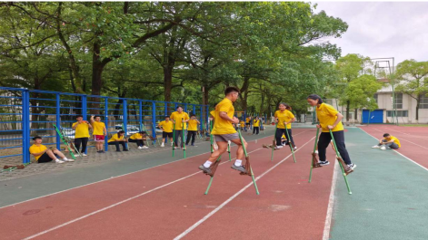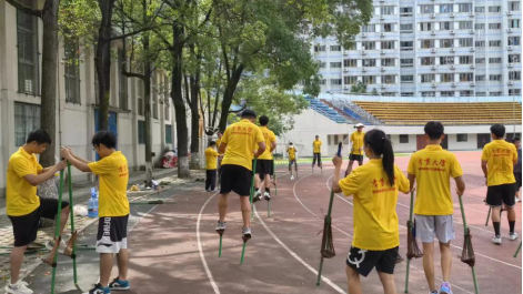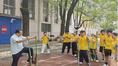 另一边,高脚马技术的教学则由李兴平教授负责。他首先为学员们详细介绍了高脚马的起源、发展历程、构成、竞技形式以及安全须知,让学员们对这项古老而充满挑战的运动有了初步的了解。李教授强调了身体平衡与协调性在高脚马技术中的核心地位,并分享了“蹬、踏、贴、走”的上马行走口诀,让学员们对高脚马的技巧有了更清晰的认识。在实操环节,学员们在李兴平教授的指导下,学习了高脚马的正确使用方法和身体平衡技巧。之后,李教授为学员们示范和讲解了杠上单脚跳和双脚跳的练习,用以提高身体稳定性和对高脚马的适应性。经过反复练习,学员们基本掌握了高脚马的基本技术。为了检验学员们的学习成果,李兴平教授还组织了形式多样的高脚马竞技赛。在激烈的比赛中,高脚马运动的独特魅力在学员们身上得到了淋漓尽致的展现。