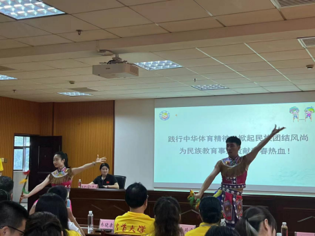 闭幕式开始前,民族体育项目第一、二、三组和田野调查组分别进行了成果汇报。项目二组进行理论课学习感悟反思总结的汇报,并将所学板鞋、花样跳绳、霸王鞭等传统体育项目进行了展示;项目三组将汇演分为团队介绍、理论感悟、实践学习、博物馆参研、小组汇演五个模块,以文筑基、以武汇演,践行体育文化人的誓言。项目一组将暑期培训的点点滴滴一一展现在大家面前,以《八段锦》汇演收尾。田野调研组以“鼓”为线,以《保靖县葫芦镇体育非遗文化苗族鼓舞的田野调查报告》为题,从理论学习、田野点概况、田野调查实践报告三个方面进行汇报。