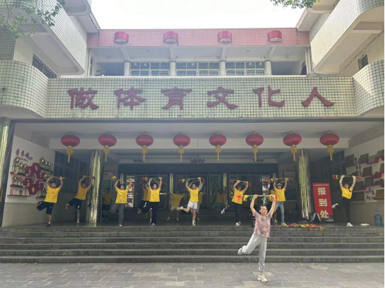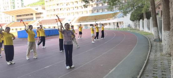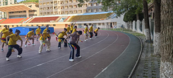 与此同时,第二组学员在朱晓红教授的带领下学习霸王鞭的技术动作。朱晓红教授介绍到霸王鞭起源于民间祭祀活动,经过逐步的发展变成了一种具有观赏性的舞蹈形式。朱晓红教授从最基本的握鞭姿势、步伐和手部动作开始教学,学员们逐步掌握了霸王鞭的基本动作要领,接着便带领学员们一起学了8个八拍的动作,随着音乐的节奏进行练习。此外,朱晓红教授指出在今后的学习与生活中,需不断提高自己的专业能力,多多接触与学习民族传统体育项目,在未来教学工作中可以更加得心应手。当天下午3点,两组成员进行交换学习,并在学习结束后进行交流与探讨。