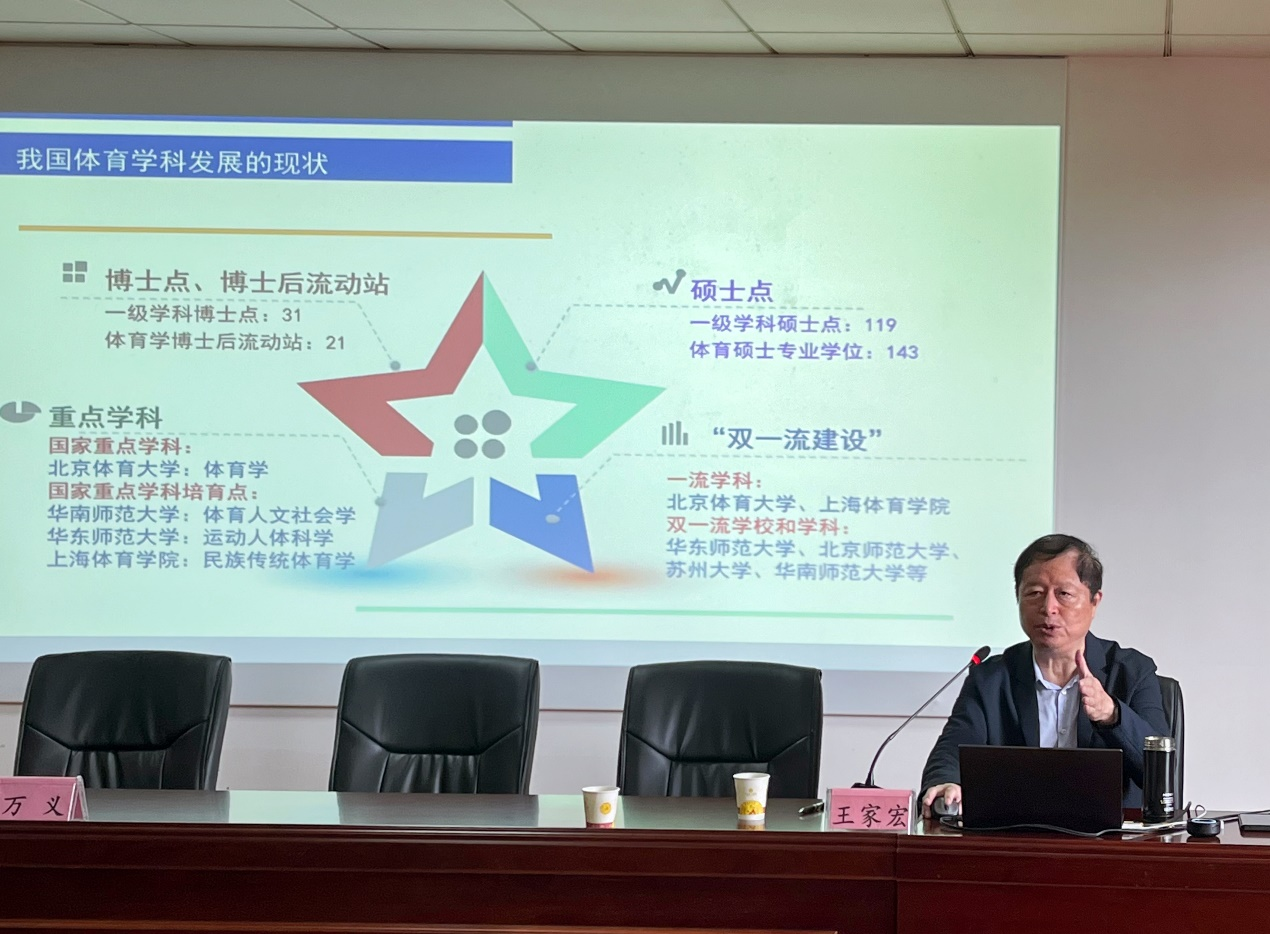 首先王家宏教授以《现代体育科学研究进展》为主题,向同学指出当前我国体育学科发展的现状以及如何构建体育学及其学科体系是我国目前深入研究体育科学的现实任务。王家宏教授向同学们讲述了目前我国体育学科的发展历程及其在发展过程中存在问题,和未来体育科学研究的发展趋势,为全体同学厘清了体育科学研究的方向。