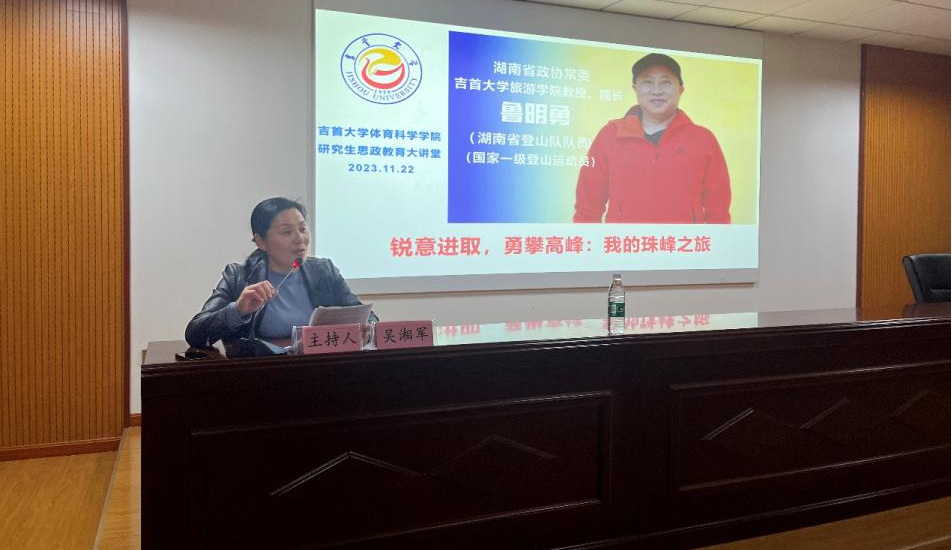 (通讯员罗湘豫、闫玲凤报道)为加强研究生的思政教育,提升研究生人才培养的质量,促进学生全面发展,2023年11月22日,体院科学学院在总理楼体育学博士培训培养重点基地大会议室成功举办了“鲁明勇:锐意进取,勇攀高峰:我的珠峰之旅”主题讲座,拉开了体院研究生思政教育大讲堂的帷幕。出席本次会议的有威廉希尔中文官网党委书记吴湘军教授及体院部分教师和体院全体研究生,讲座由吴湘军主持。