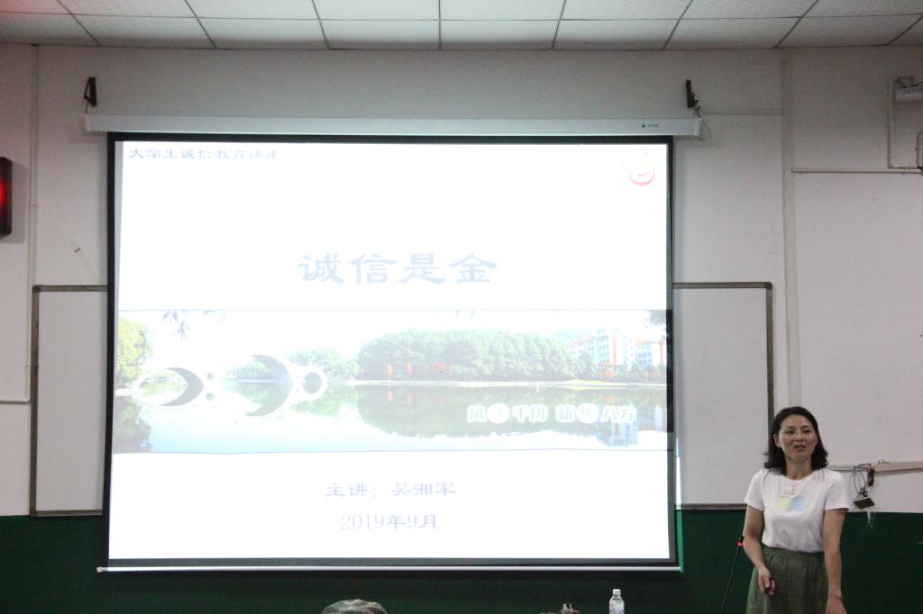 为加强2019级新生诚信教育,进一步提高同学们诚信意识,树立诚实守信的观念。9月12日晚7:00在阶梯教室1207室,我院吴湘军副书记为2019级新生们带来了一场“诚信是金”的教育讲座。