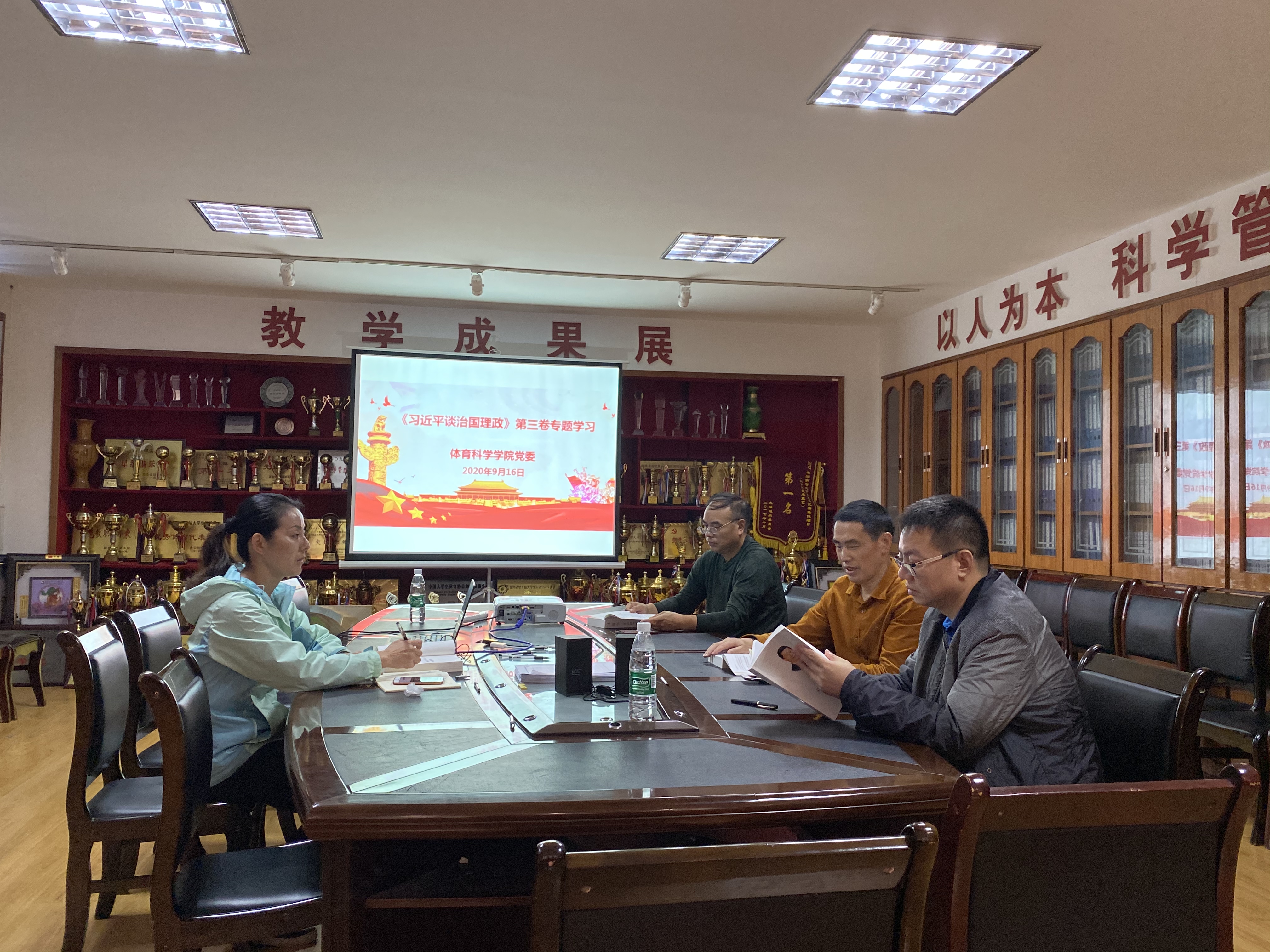 根据威廉希尔中文官网宣传部【2020】11号文件精神,威廉希尔中文官网党委自9月11-17日期间,积极发动院党委各支部利用业余时间结合集中与个人自学等方式认真学习《习近平谈治国理政(第三卷)》。9月16日上午10点,院党委中心学习组周道平、吴湘军、万义、吴永海等同志在砂子坳校区体育学院二楼荣展室进行集中学习,首先,党委副书记吴湘军传达了威廉希尔中文官网宣传部【2020】11号文件精神,并和大家一起选读学习了《习近平谈治国理政(第三卷)》中二、十一、十九主题分别是“坚持加强党的领导”“铸就中华文化新辉煌”“不忘初心、牢记使命把党的自我革命推向深入”等章节部分内容。