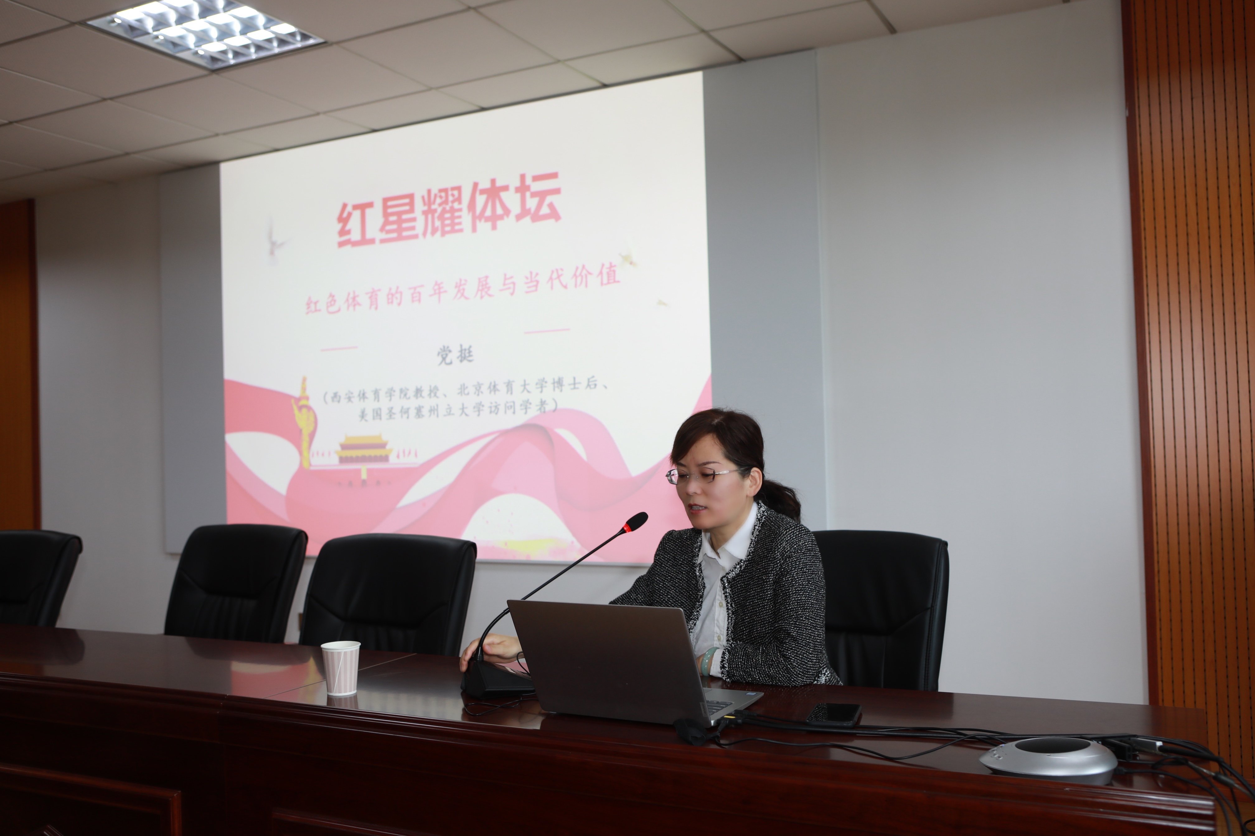 党挺教授以“红星耀体坛——红色体育的百年发展与当代价值”为题,从中国共产党红色体育的百年历程、特征、历史贡献以及深远影响讲述了我国红色体育的百年发展与当代价值;让在场的师生全面了解红色体育是我国特殊历史时期中国共产党领导下开展的体育活动,它不仅体现为劳苦大众争取生存权力的革命内容,还是贯彻党的路线、方针、政策的良好途径,红色体育的意义和现代价值主要表现为彰显体育参与是大众的基本权利。