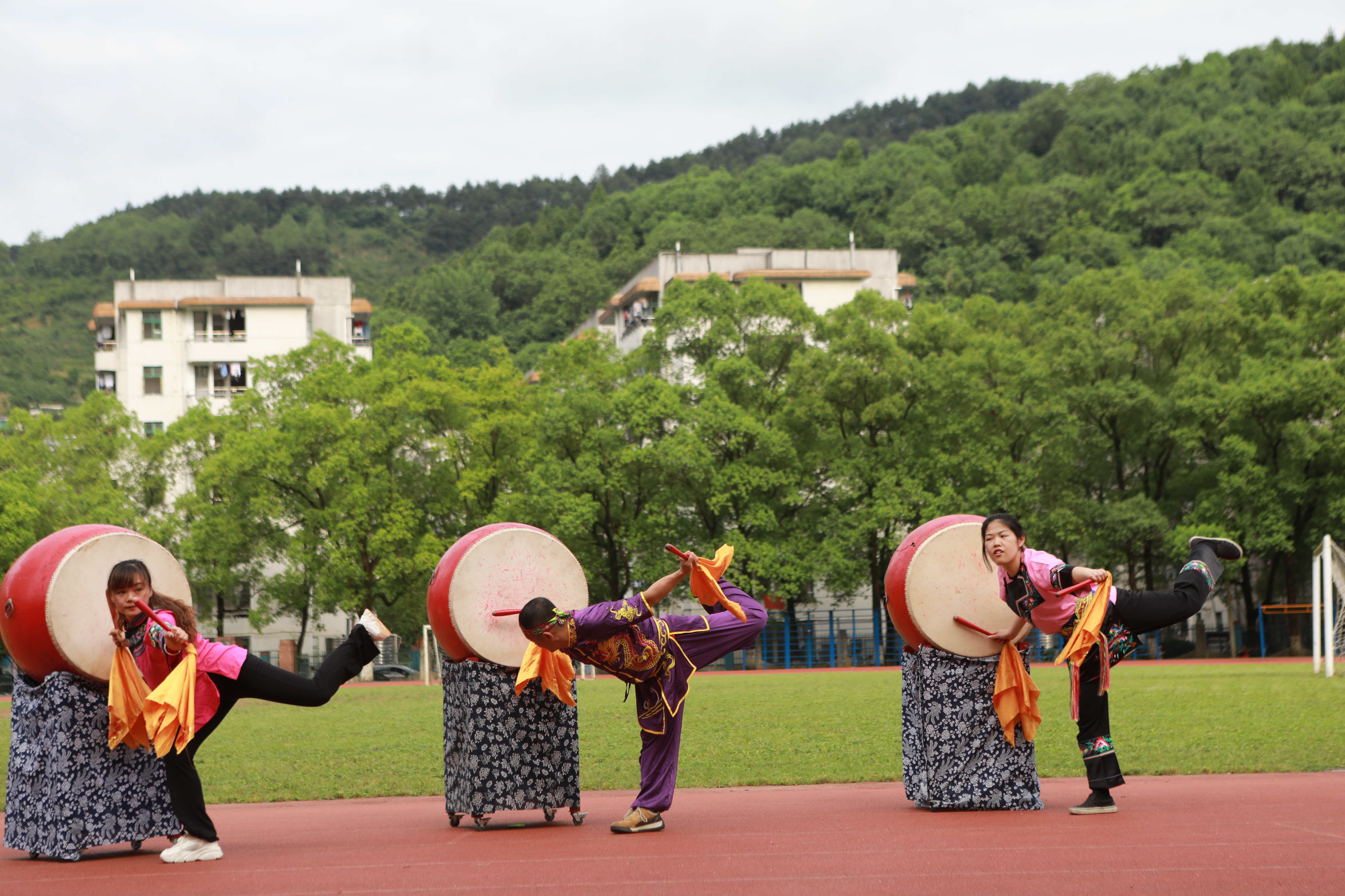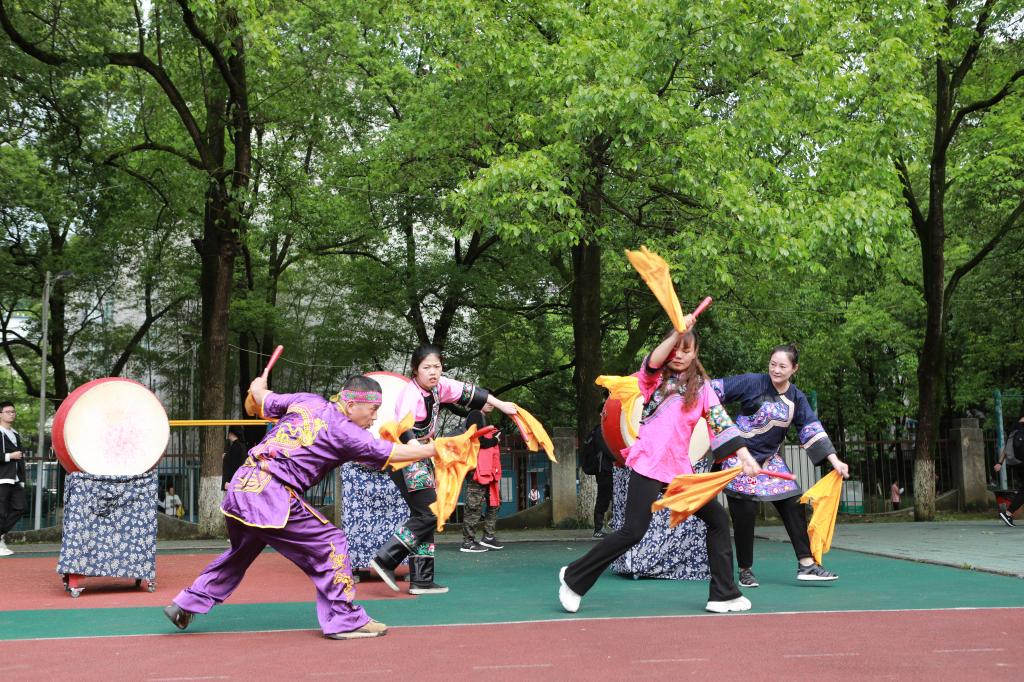 上图为马文国博士与我校师生一同表演湘西武鼓