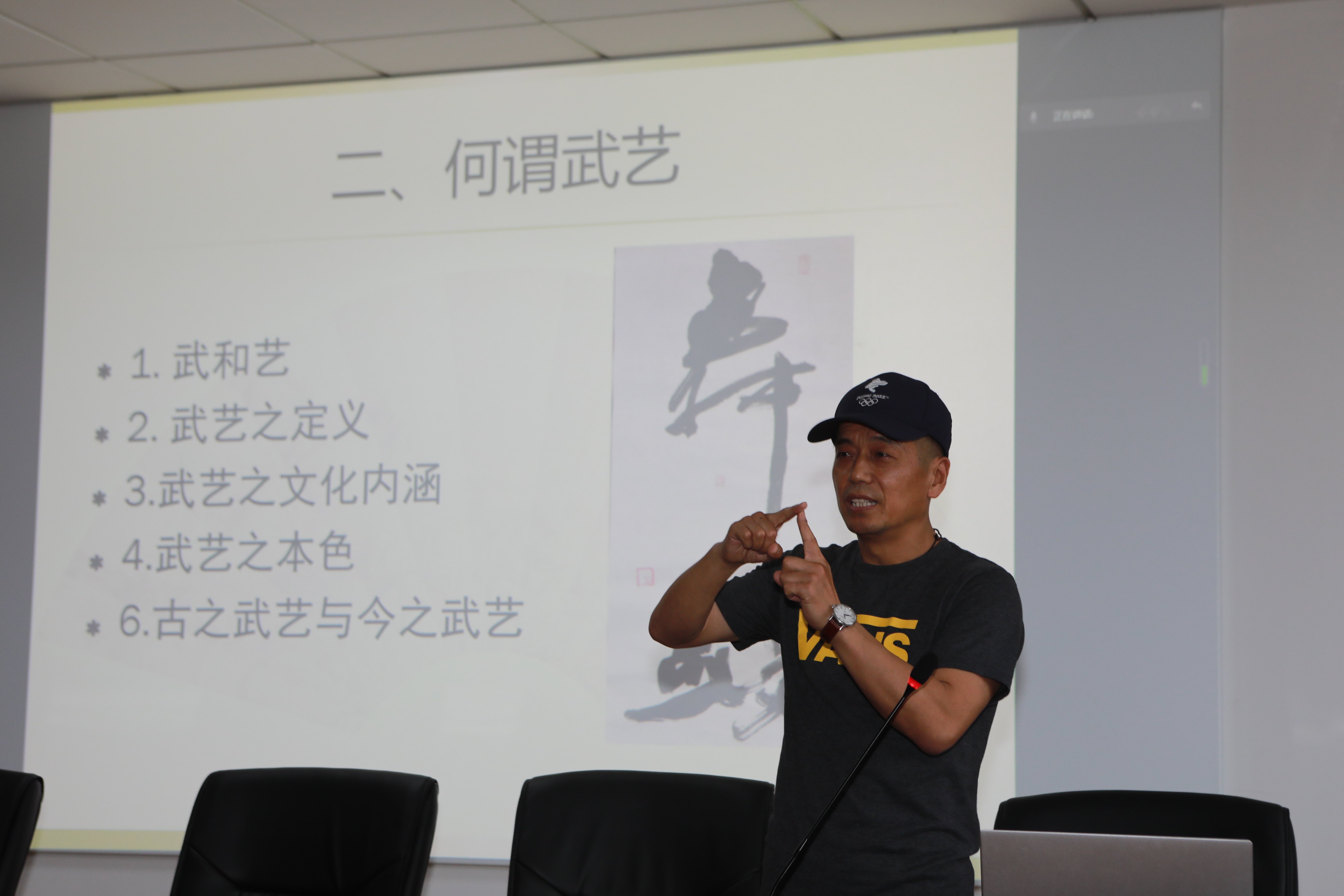 马文国博士以“武术、武艺与武道——古典武艺的传承与使命”为题,从何谓武术、何谓武艺、何谓武道、当代古典武艺的提出和古典武艺的溯源五个方面诠释了古典武艺的传承与使命,提出了体育人应具备“疯魔的献身精神、专业的示范能力、文武兼备的风范、兼收并蓄的胸怀、终身不辍的耕耘、甘于寂寞的斗志”的素养。讲座中马文国博士的殚见洽闻以及武术大师的风范深深吸引着全场的师生,赢得了阵阵掌声。