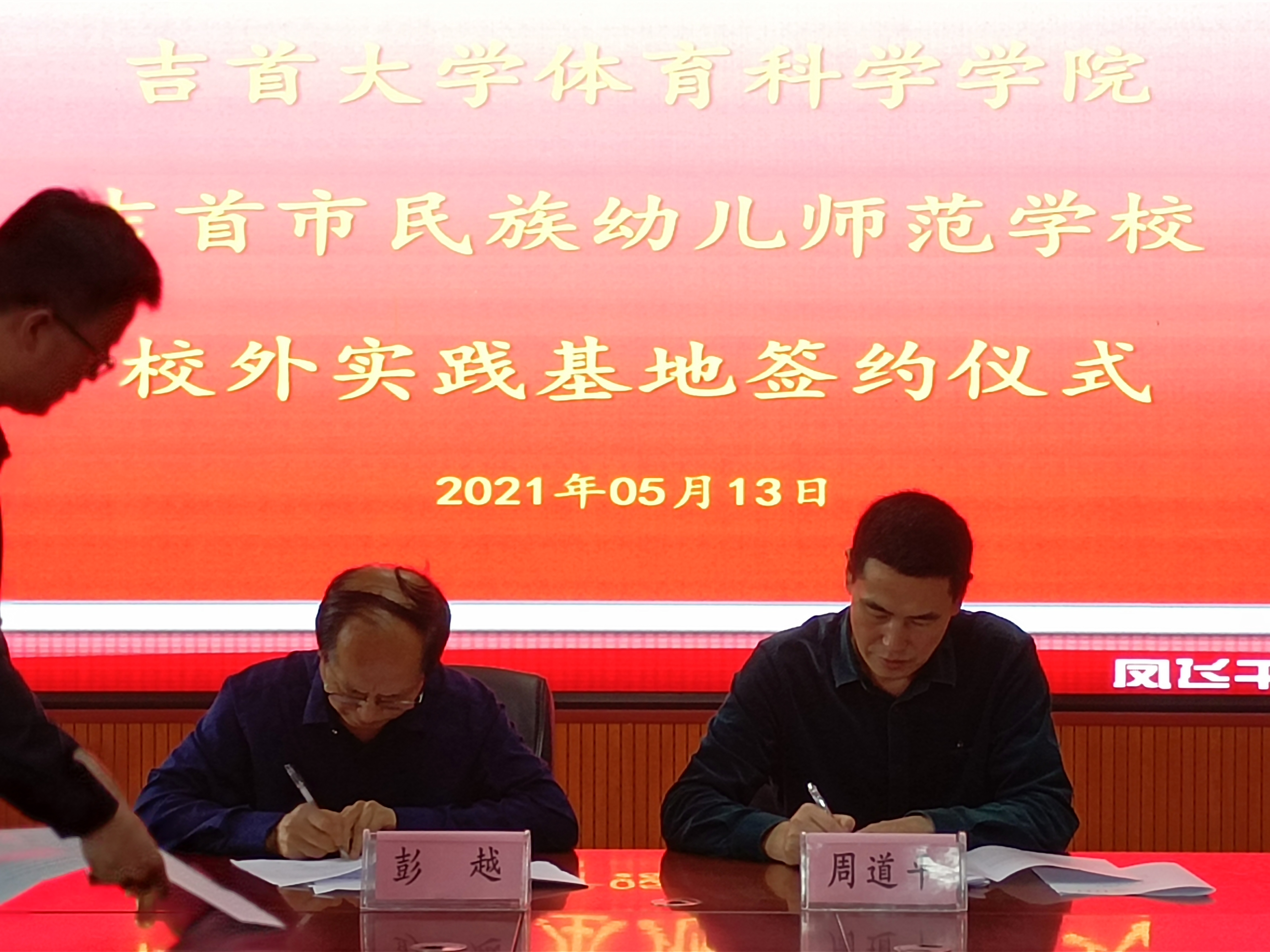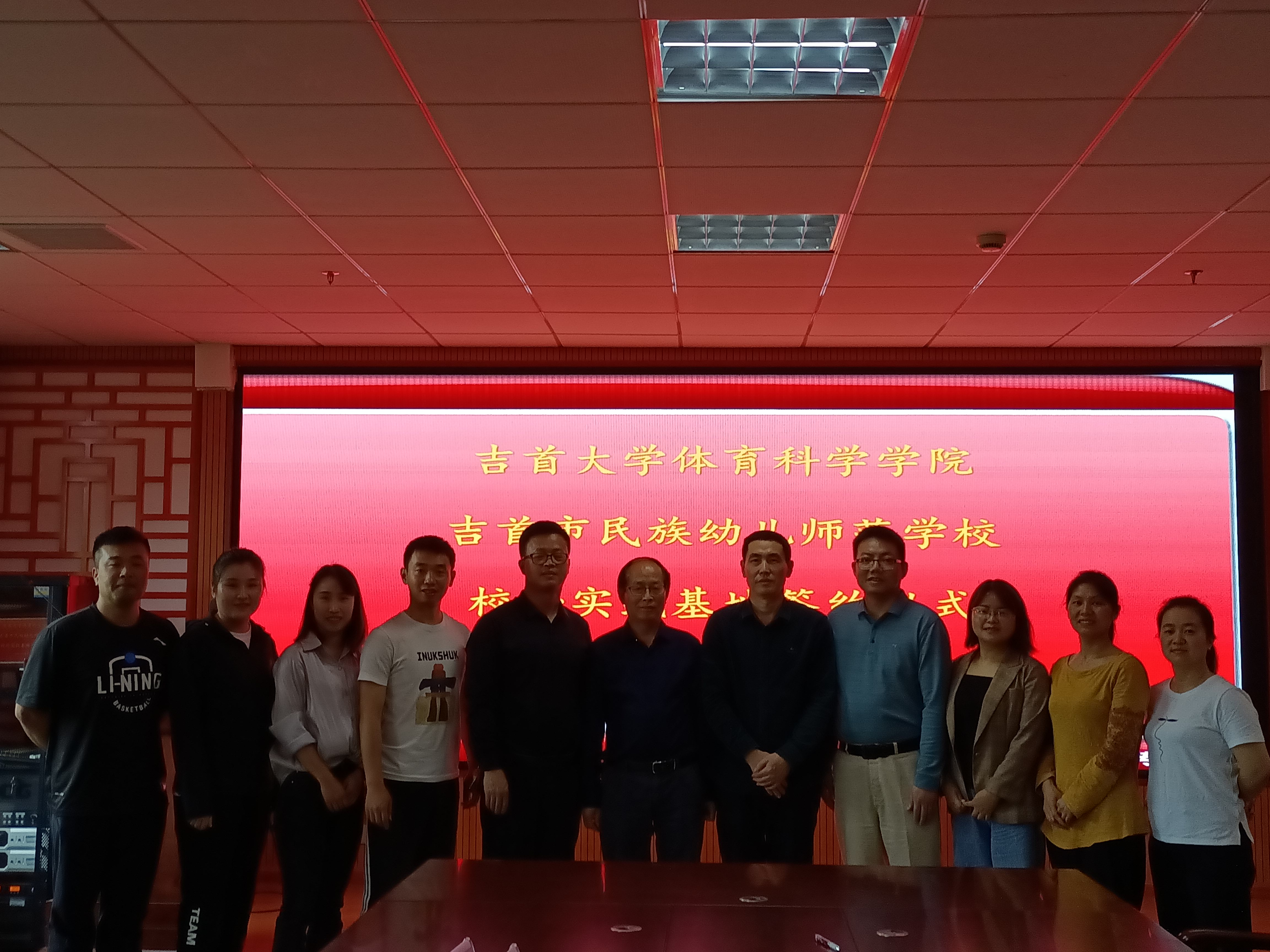 (本网讯:王澳伦)5月13日上午10点,吉首市民族幼儿师范学院彭越校长等一行六人来我院参加两校校外实践基地签约仪式,我院周道平院长、万义副院长、谌晓安、王月英、熊静梅老师出席本次仪式。仪式于总理楼体育学学院三楼答辩室举行,双方签订《师范教育实习基地建设协议书》。