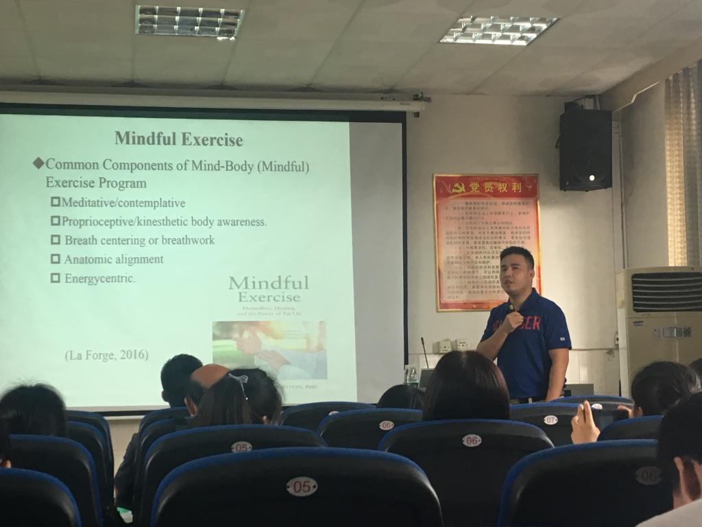邹立业教授以《身心运动》为题,结合太极拳的特点,从打坐、冥想、身体的意识、呼吸、气等方面进行了深入浅出的讲述,使大家如沐春风、受益匪浅。