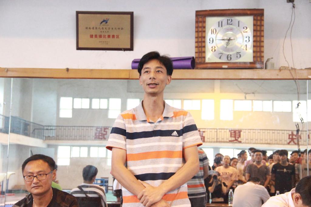 周道平院长致词。他讲到体操课程是人才培养方案中最重要的课程,希望同学们把体操所学知识合理运用。本次比赛暨结业考试是检验同学们这一年的学习成果,希望同学们可以认真对待本次比赛。同时裁判员要认真负责,公平认真的协调评判好本次比赛。并预祝本次比赛圆满成功。