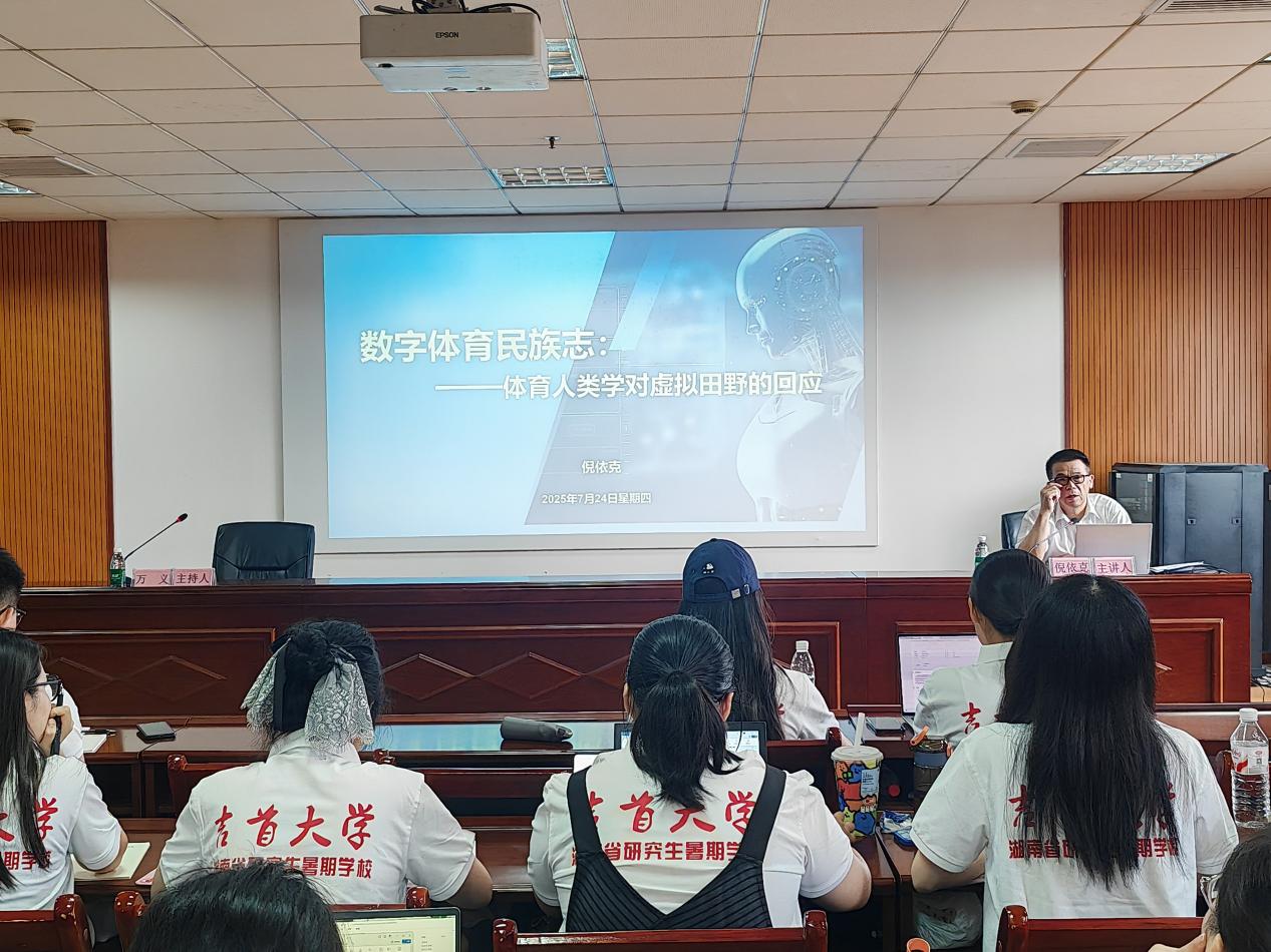 (通讯员张泽文、李强、李琳报道)2025年7月24日上午9点,中国人类学民族学研究会体育人类学专委会副主任委员倪依克教授在总理楼三楼会议室进行了以《数字民族志:——体育人类学对虚拟田野的回应》为题的学术讲座,本次讲座由万义教授主持。“共享湘西非遗·民族体育文化”研究生暑期学校的全体学员参与了本次讲座,一同深入探究数字体育民族志的内在含义、显著特征,并剖析其在学术研究领域所具有的重要意义。