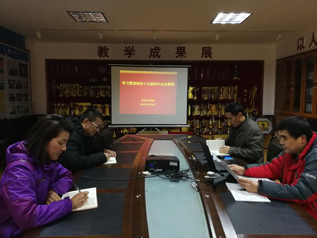 12月18日下午在学院二楼荣展室,学院行政领导班子集中学习贯彻党的十九届四中全会精神,肖松书记主持整个学习过程。