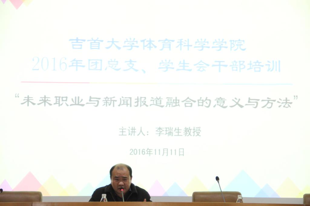 (本网讯:于敏、陈宝玉、张成兵)11月11日18:40,我院于图书馆学术报告厅举办威廉希尔中文官网威廉希尔中文官网2016年团总支、学生会干部培训,李端生教授作“未来职业与新闻报道融合的意义与方法”主题讲座。讲座由团总支、学生会主办,威廉希尔中文官网学工办主任宁珊珊老师主持。我院辅导员彭友老师、习鑫老师及90多名学生干部参加了本次讲座。