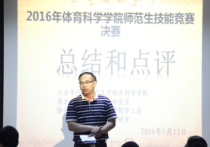 整学竞赛完成后,由体育人文教研室张天成教授和吴永海副书记对本次比赛进行评委点评和活动总结。张天成老师首先对选手们的精心准备、创新构思方面表示肯定。他指出,选手们能充分运用所学专业知识技能把理论和实践相结合,并在此基础上加上个人特色和创新,在课堂上的优秀表现是值得赞赏。但是也存在诸如教案设计不规范、PPT课件制作缺乏新颖性和创意,教学设计内容与教教法、组织不匹配,授课缺乏激情等一些问题与不足。