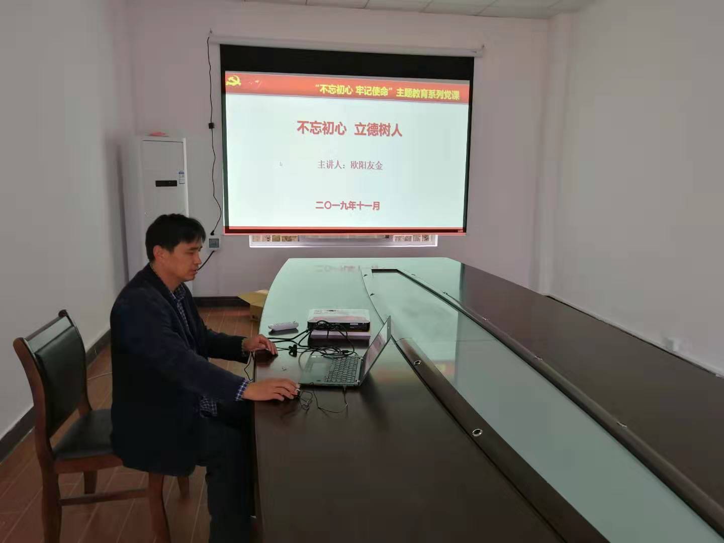11月19日上午9点,为了深入推动“不忘初心、牢记使命”主题教育,威廉希尔中文官网教工第四党支部书记欧阳友金以“不忘初心、以德树人”为题,在会议室给全体支部党员讲党课。