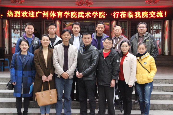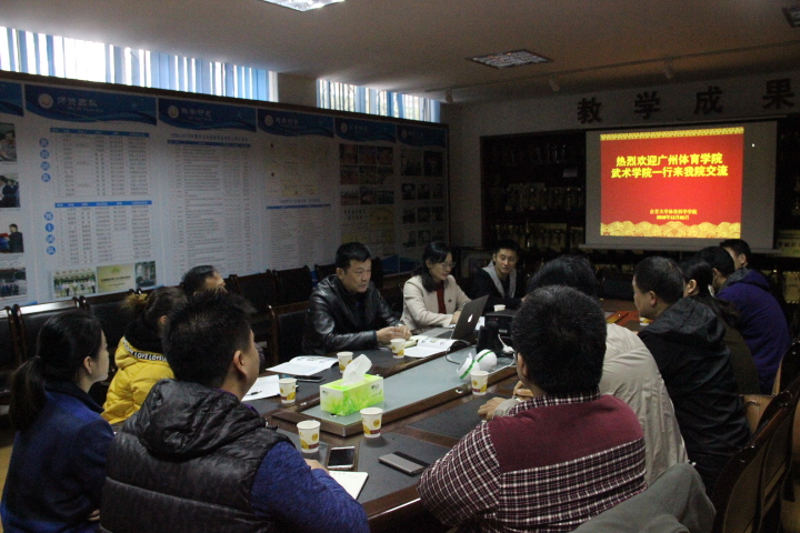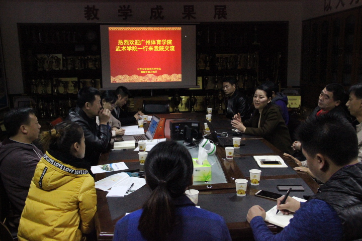 12月1日上午10:00点广州体育学院武术学院副院长罗智一行6人来我院参观交流学习。学院党委书记肖松,副院长张小林、吴湘军,民族传统体育教研室主任舒颜开博士,院学科建设办公室主任万义博士,刘卫华博士,院办公室文理中老师等在学院荣展室与广州体育学院的同仁们进行了交流。