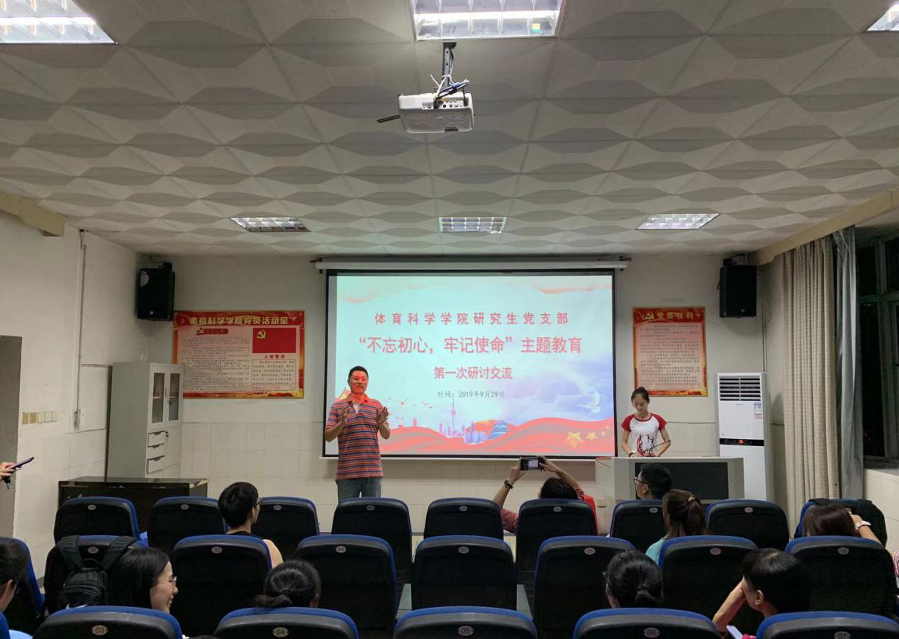 为深入开展“不忘初心、牢记使命”主题教育,弘扬爱国主义精神,2019年9月29日下晚上,威廉希尔中文官网研究生党支部在院三楼举行“不忘初心、牢记使命”主题研讨交流活动。参加交流会的党员有体育学院博士及硕士研究生。