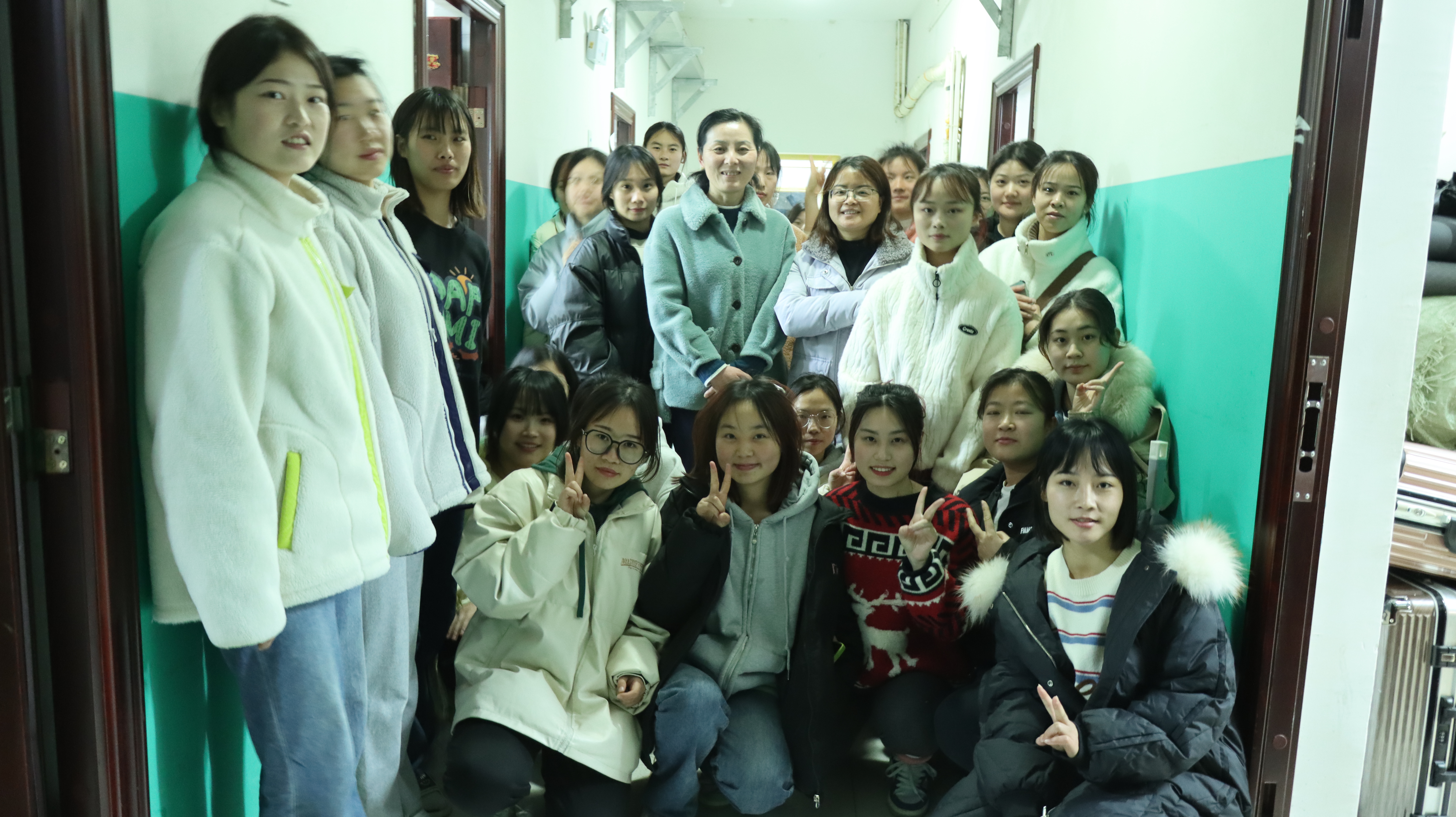 图为 吴湘军书记、谌晓安副院长到寝室看望女生并合影