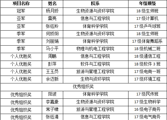本期网讯:(罗荣锦) 马拉松运动是对“挑战自我、超越极限”体育精神的淋漓表现,正越来越受到世界各国、包括国内许多城市及政府的高度重视。我们由衷地希望全校师生员工积极投身到体育锻炼中去,让身心健康成为一种追求,将全民健身作为一种风气。希望广大同学积极参加“走下网络、走出宿舍、走向操场”主题群众性体育锻炼活动,锻炼体魄,锤炼意志,在环绕“校园”的黄金赛道上,用力量和激情演绎生命的无限精彩,用奔跑与速度体验新余学院的跨越式发展活力。本次活动共1397名参与者,历时共174天。经个人表现,最终杨月娇等14名同学为2018绿色长征“迷你马拉松”大学生线上跑获奖学员,以下是获奖名单。(联系方式:0743-8537887)